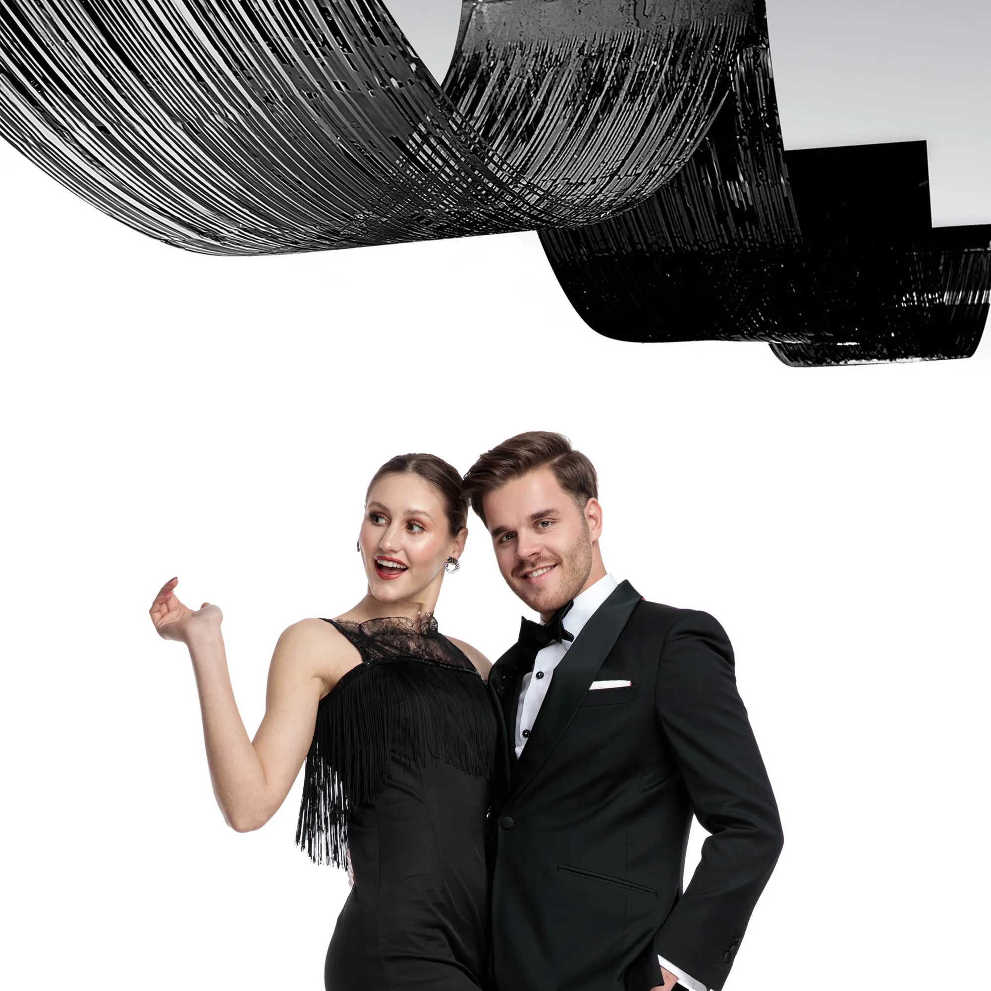 Elevate your event's ambiance with our Black Metallic Fringe Ceiling Curtain, measuring 19 1/2"tall by 16' long. This striking decoration adds a layer of elegance to any venue, perfect for creating a dramatic overhead display at galas, New Year's celebrations, or sophisticated soirées. With the double-sided tape included, hang it above dance floors for a shimmering effect, or use it to transform large spaces into intimate, enchanting settings. This versatile 1-ply ceiling curtain is a must-have for adding a touch of glamour & sophistication to your special events. Sold by the individual curtain. Please order in increments of 1 curtain.