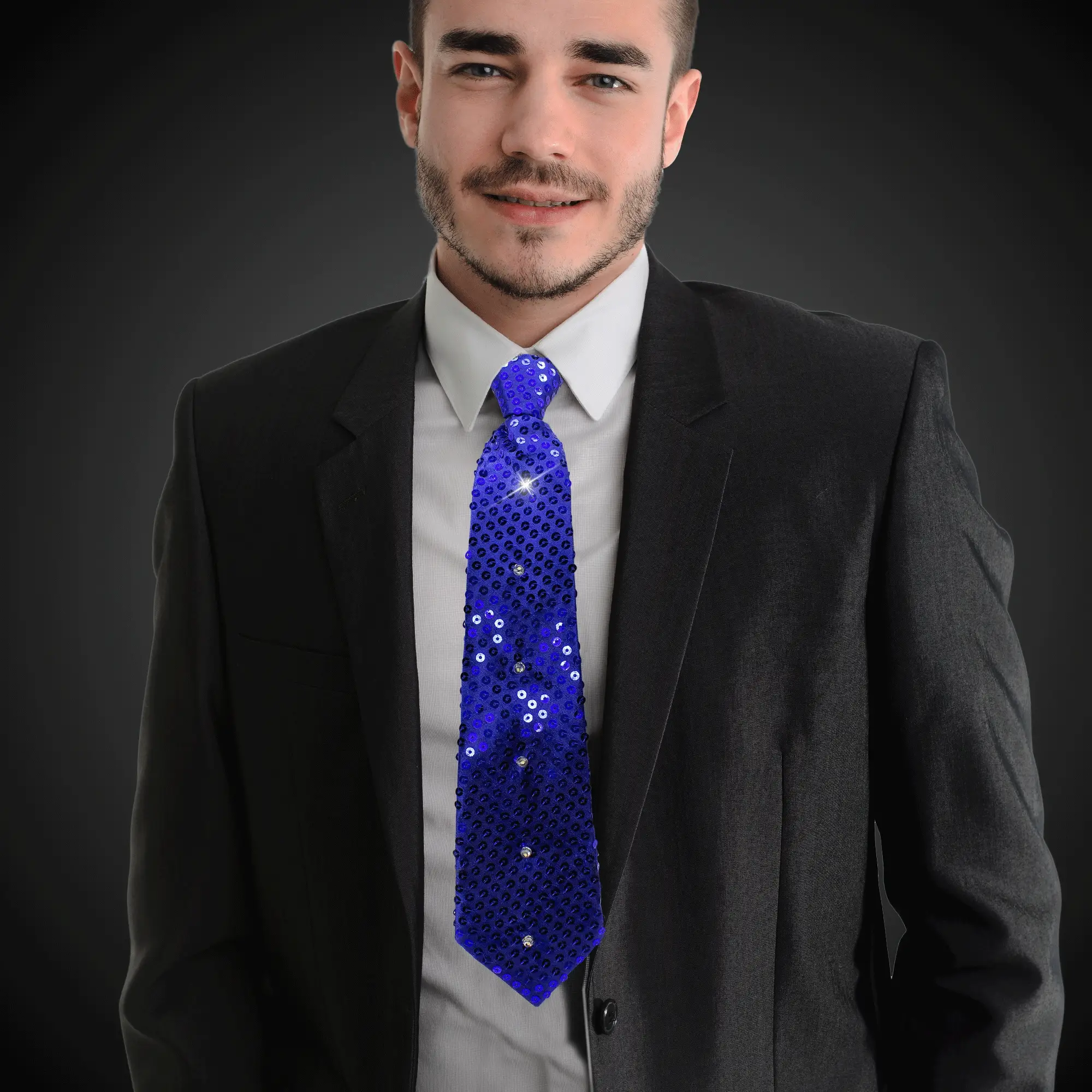 Our LED Blue Sequin Necktie has a special surprise feature, bright white LEDs! Each blue sequin tie is 14" long including the knot and slips over almost any size head and can fit almost any size neck with an easily adjustable zipper style closure. Each light-up sequin necktie features 6 bright white LEDs down the front of the blue necktie. Our light-up sequin neckties are perfect for adding something unique and fun to wedding and prom attire! Our blue sequin LED necktie features 3 different light settings; fast flash, slow flash, and steady on. Batteries are included but cannot be replaced. 3 different light settings 14" from the top of the knot to tip. One size fits most. Please order in increments of 1 necktie.