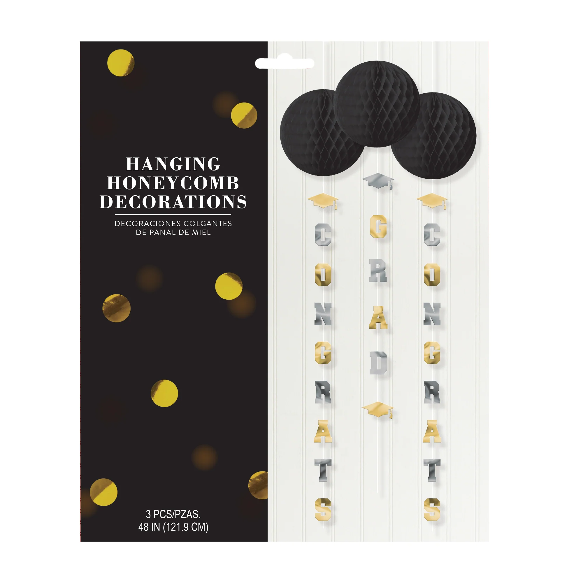 Hang this graduation message from ceilings, over tables, or entranceways Our 4' long black, silver, and gold Congrats Grad Honeycomb Danglers are sold in a pack of 3. Our metallic and black honeycomb decorations include 2 - Congrats and 1 Grad decoration hanging from 6" black honeycomb balls Please order in increments of 1 pack.
